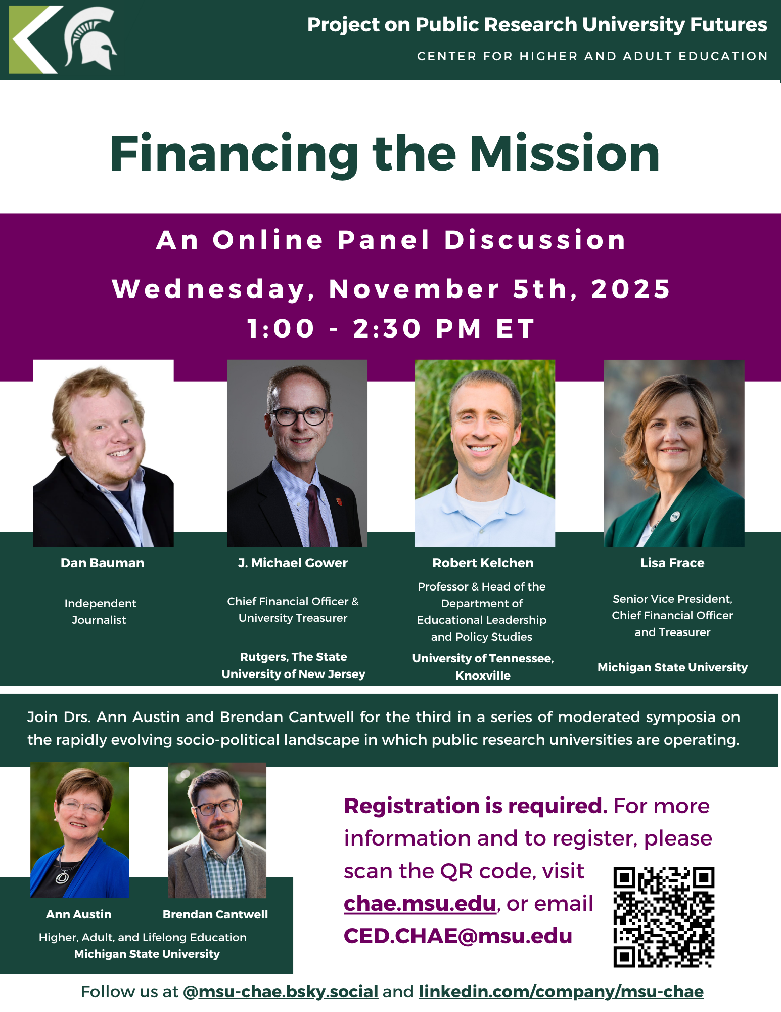 Our third online symposium is scheduled for Wednesday, November 5, 2025 – 1:00–2:30 PM (ET). In a discussion facilitated by Dr. Ann Austin and Dr. Brendan Cantwell, panelists will explore the theme “Financing the Mission.”